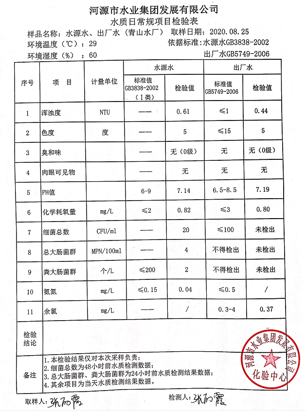 2020年8月25日水質檢驗報告