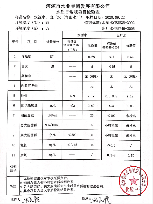2020年9月22日水質(zhì)檢驗(yàn)報(bào)告