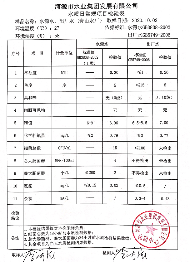 2020年10月2日水質(zhì)檢驗(yàn)報(bào)告