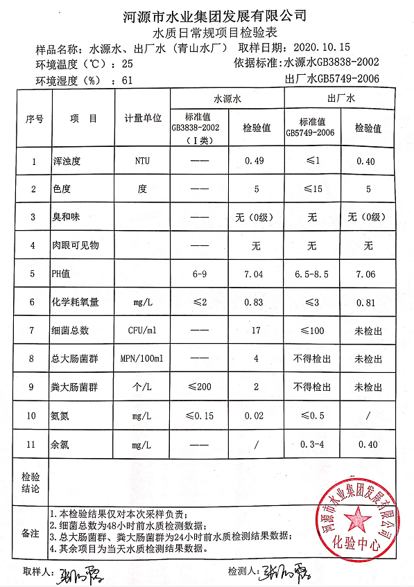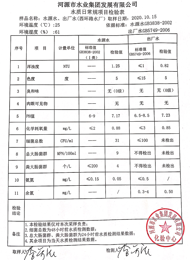 2020年10月15日水質(zhì)檢驗(yàn)報告