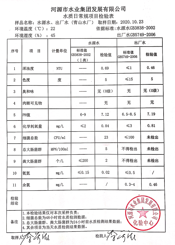 2020年10月23日水質(zhì)檢驗(yàn)報(bào)告