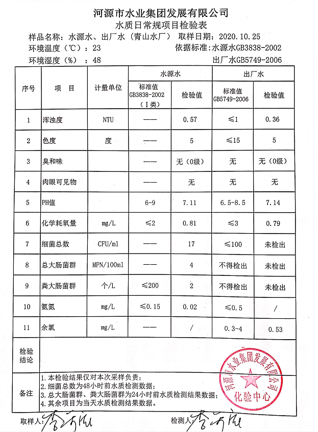 2020年10月25日水質(zhì)檢驗(yàn)報告