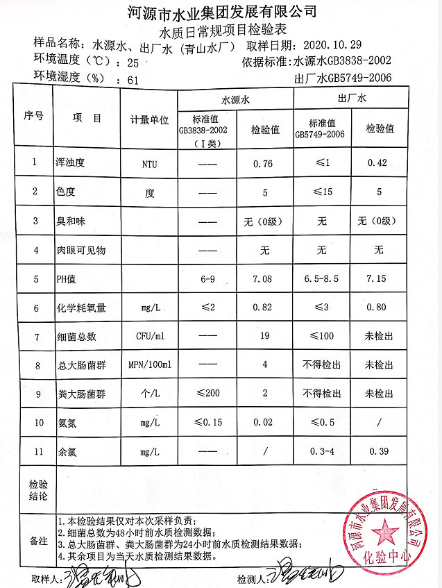 2020年10月29日水質(zhì)檢驗(yàn)報告