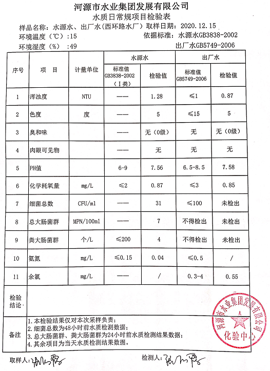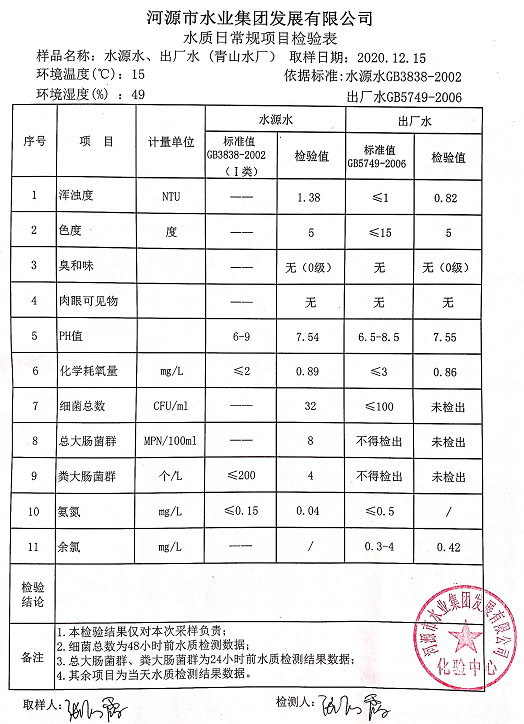 2020年12月15日水質(zhì)檢驗(yàn)報告