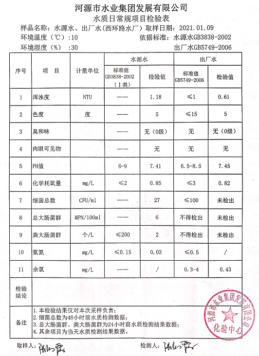 2021年1月9日水質(zhì)檢驗報告