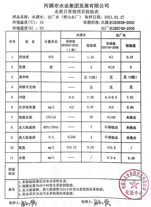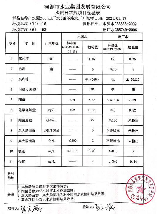 2021年1月17日水質(zhì)檢驗報告