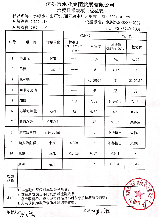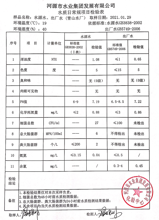 2021年1月29日水質(zhì)檢驗報告