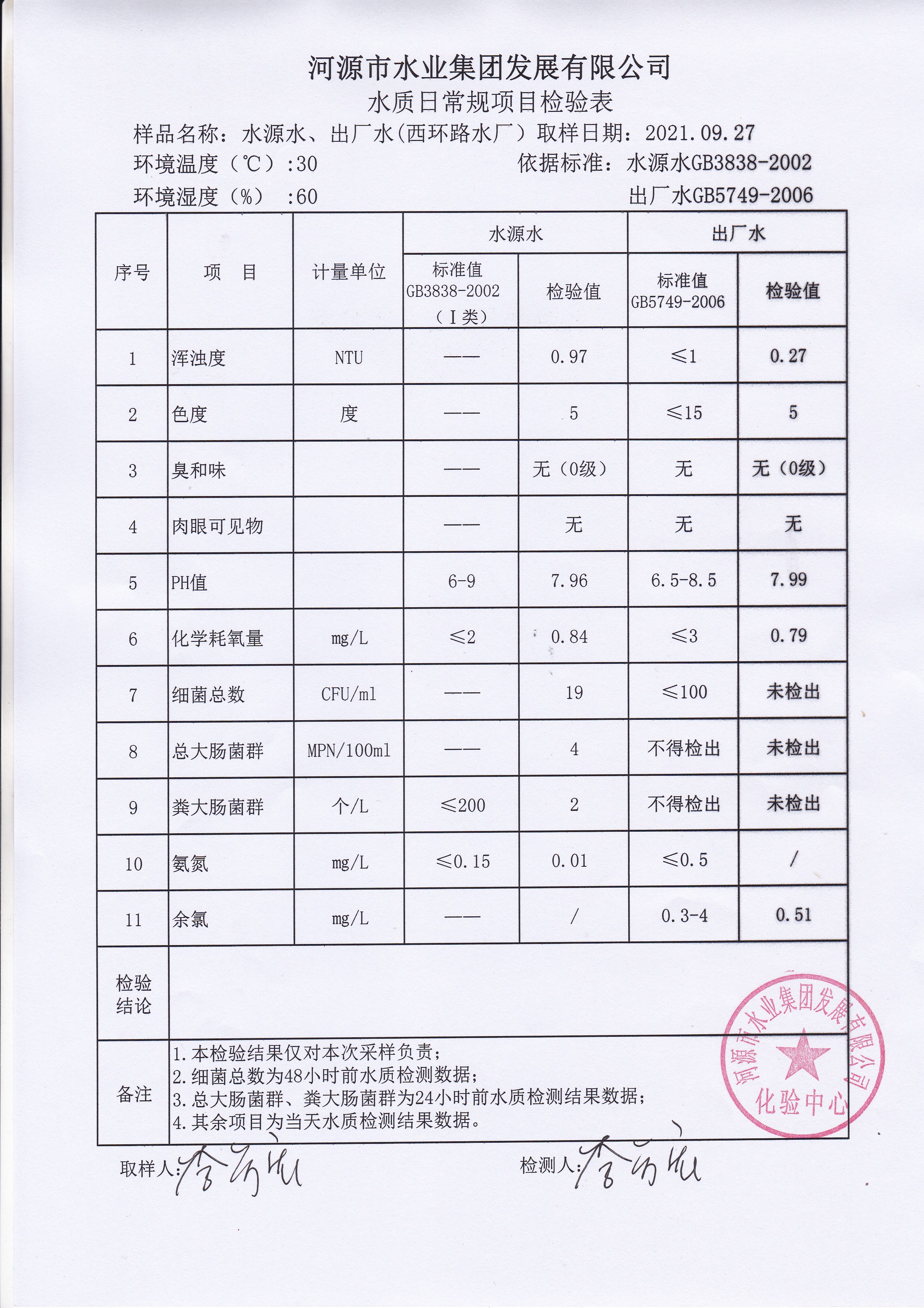 2021年9月27日水質(zhì)檢驗(yàn)報(bào)告