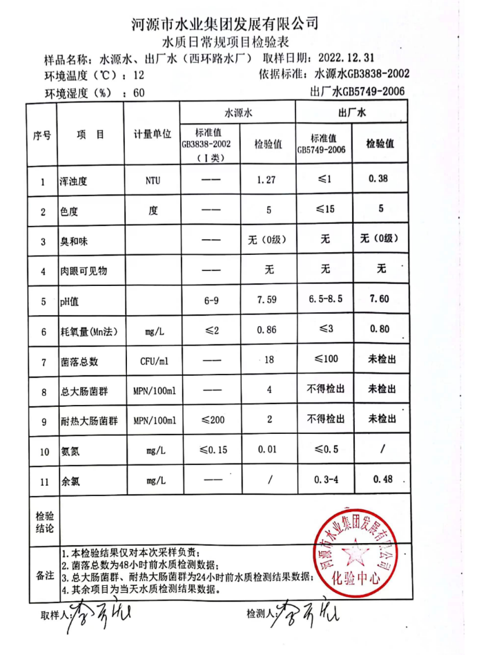 2022年12月31日水質(zhì)檢驗(yàn)報(bào)告