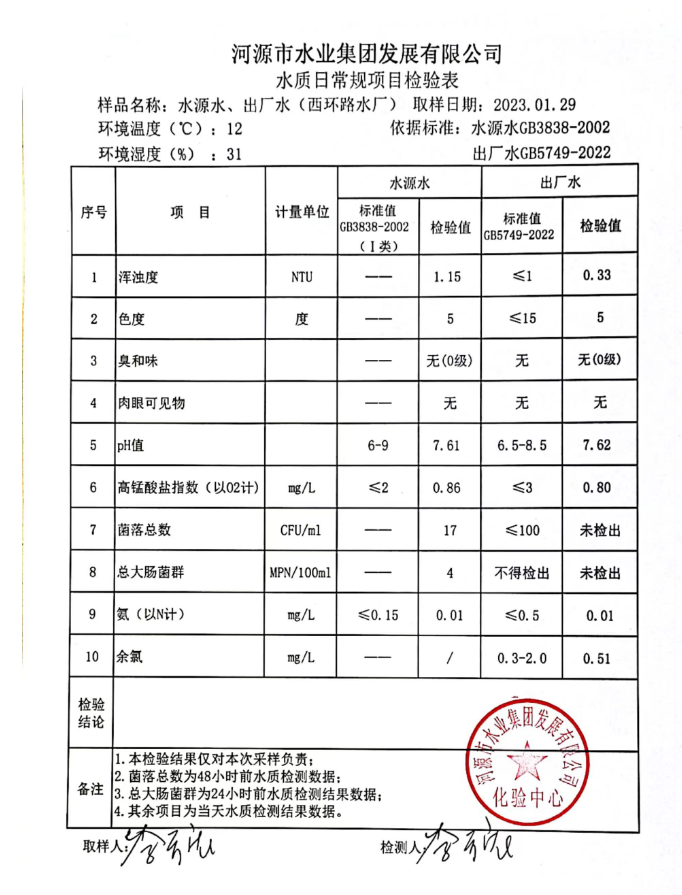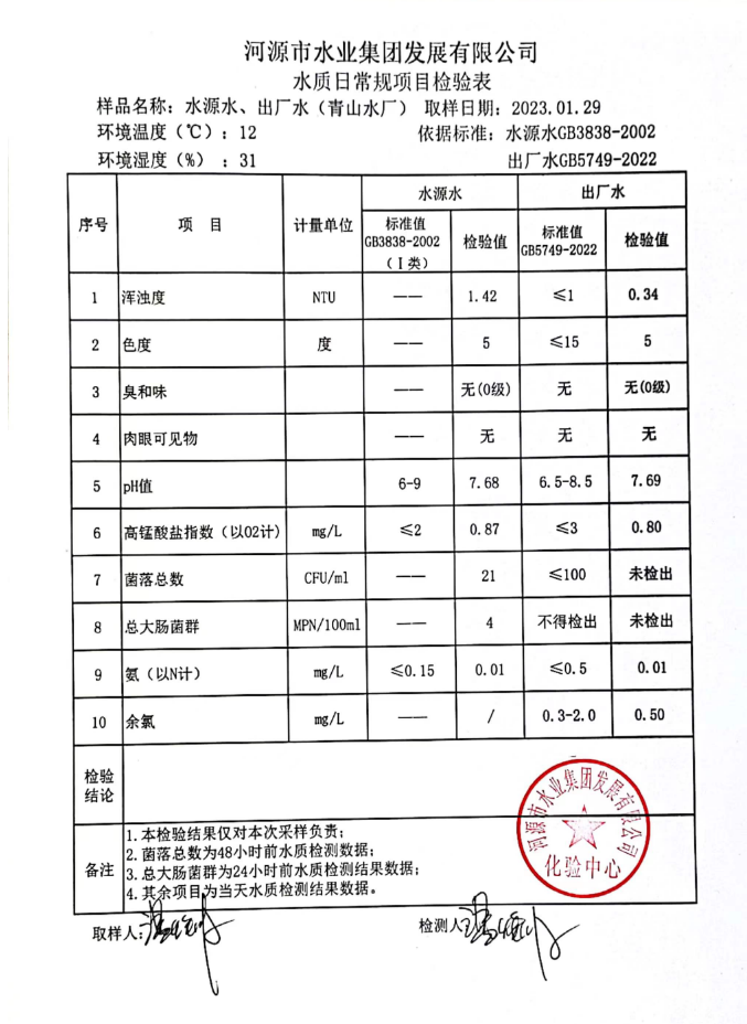 2023年1月29日水質(zhì)檢驗(yàn)報(bào)告